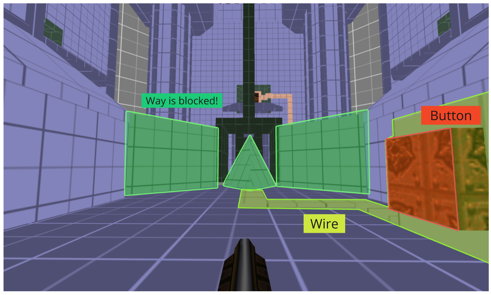 I created different puzzles based on wires connecting buttons to different mechanisms. These beats were aimed to: