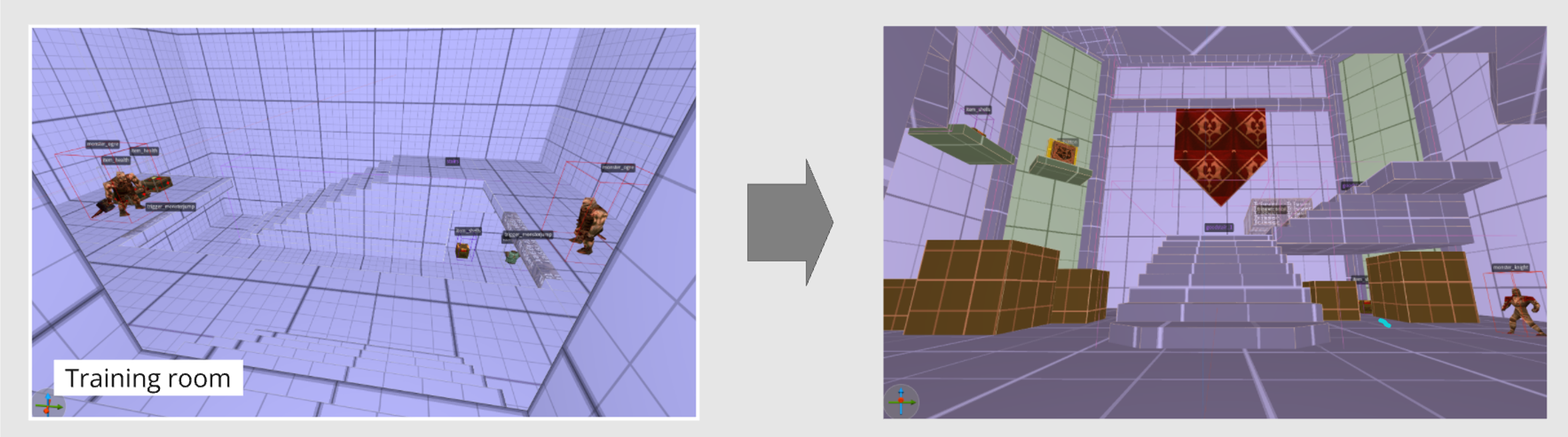 Above is an example of improving a room after receiving feedback: Here th problem was player navigation and not finding the way forward, since all areas looked similar. Following this feedback I added colors to my blockout language and created landmarks for each room to make them distinct and recognizable.