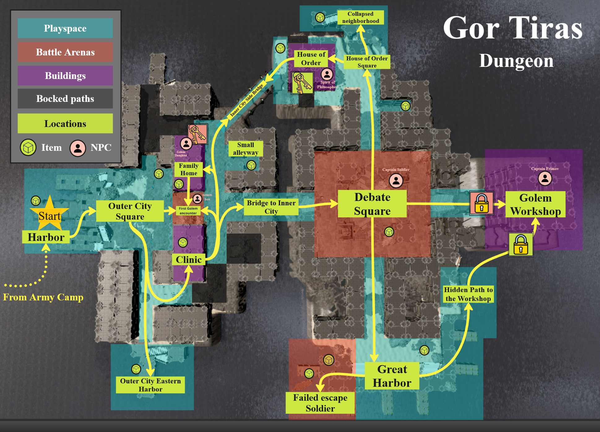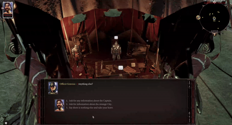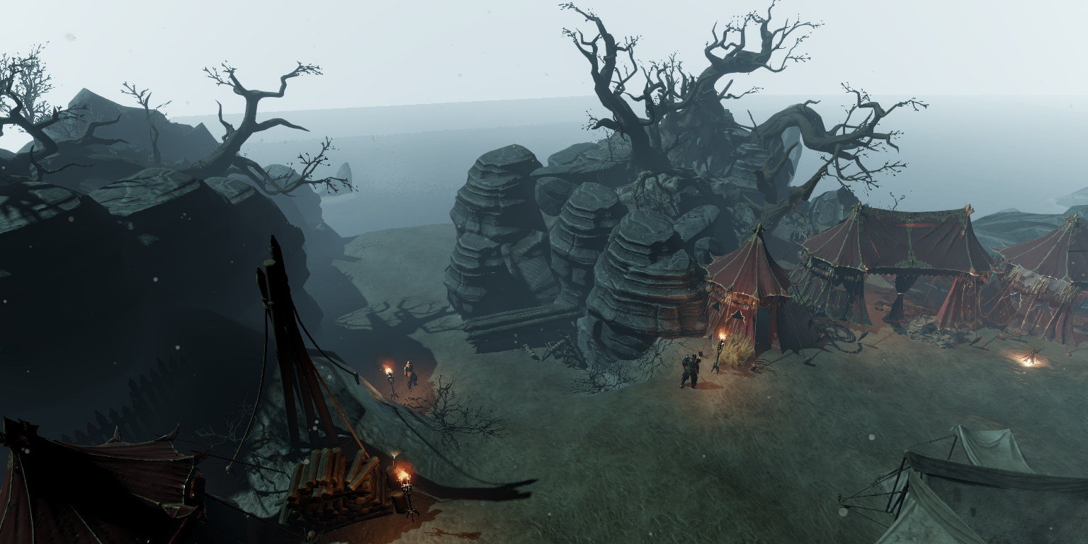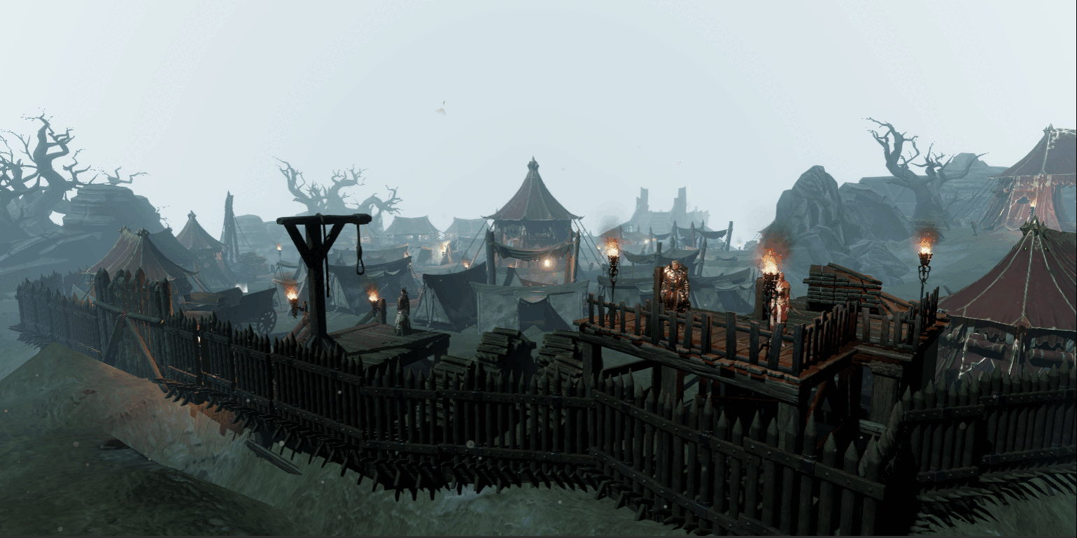 Looking for allies for the dungeon as well as information on it and the Captain the player is driven to explore the entirety of the Camp, talking to different NPCs and looking into crates, gathering gear and allies.