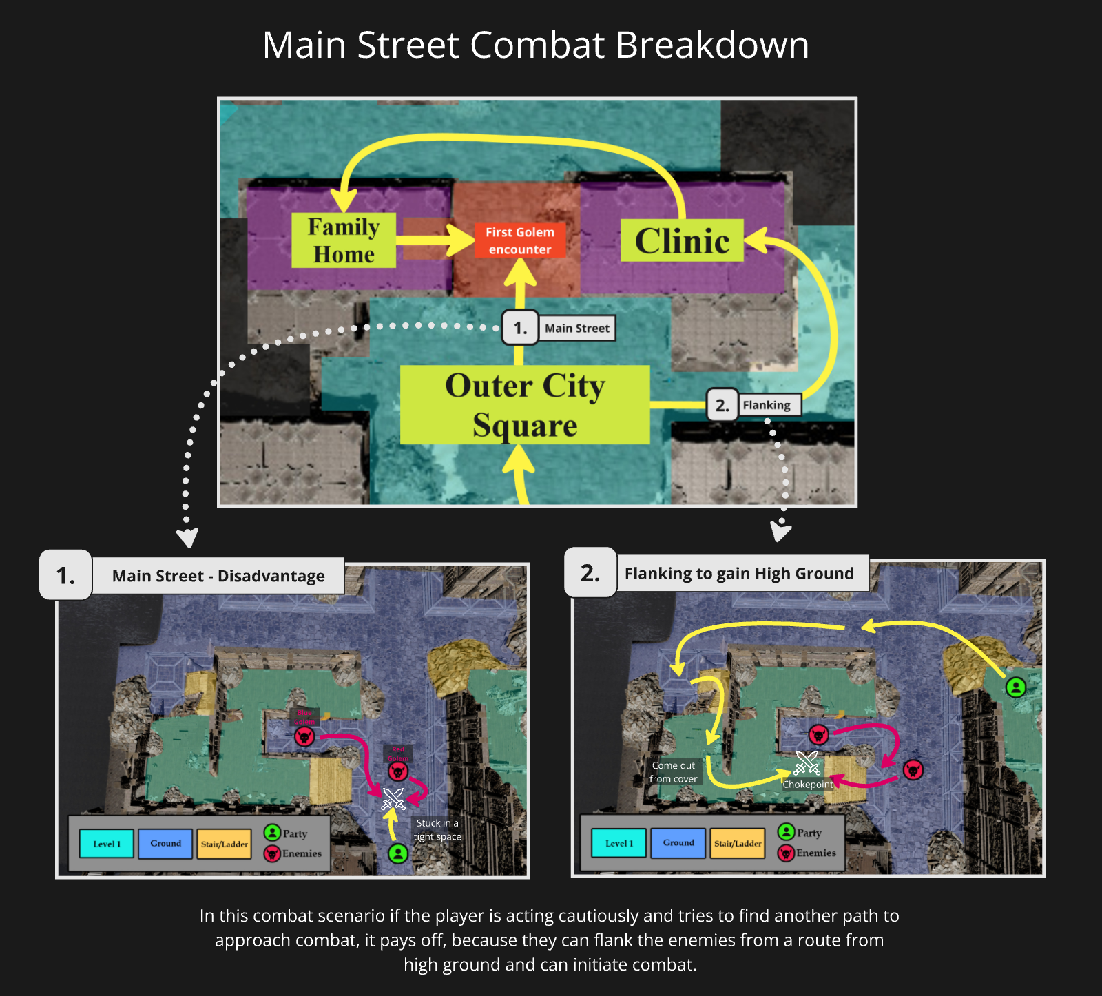 To create a dangerous, hostile, but also exciting atmosphere in the city I staged combat encounters against the Reanimated Golems of the city who play an integral part in its story. To understand the combat I researched DOS2 combat arenas and identified the main implications of covers, high ground and choke points.