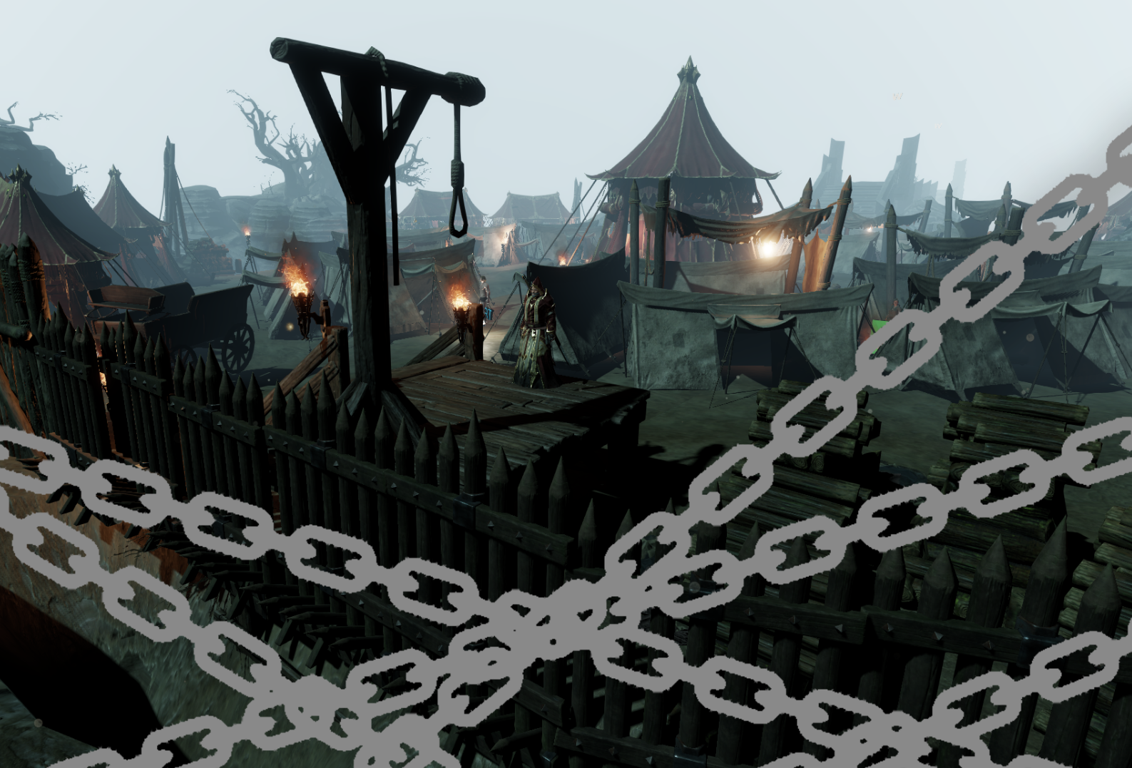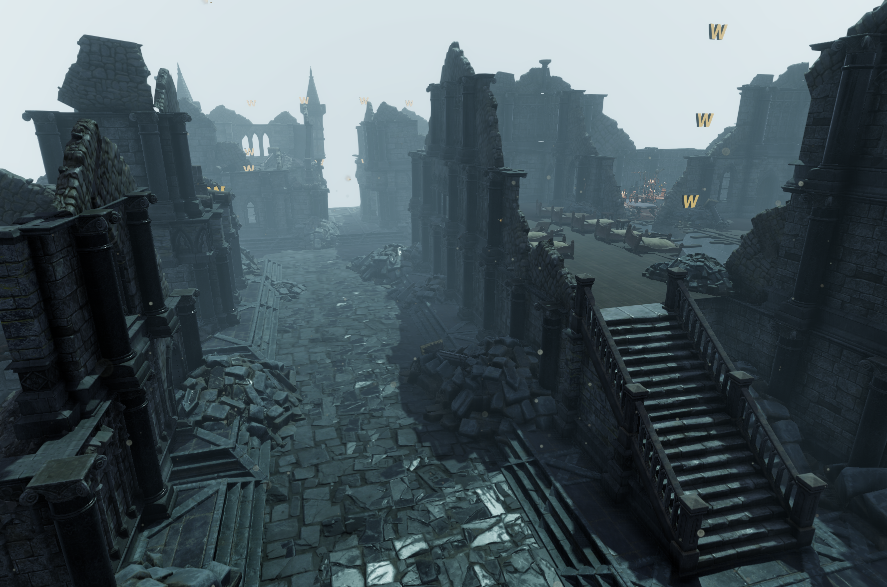 The look of the place is meant to create an eerie anticipating feeling with a damp, foggy weather, dead, withered vegetation and the introduction of the city’s ancient (ruined) architecture.
