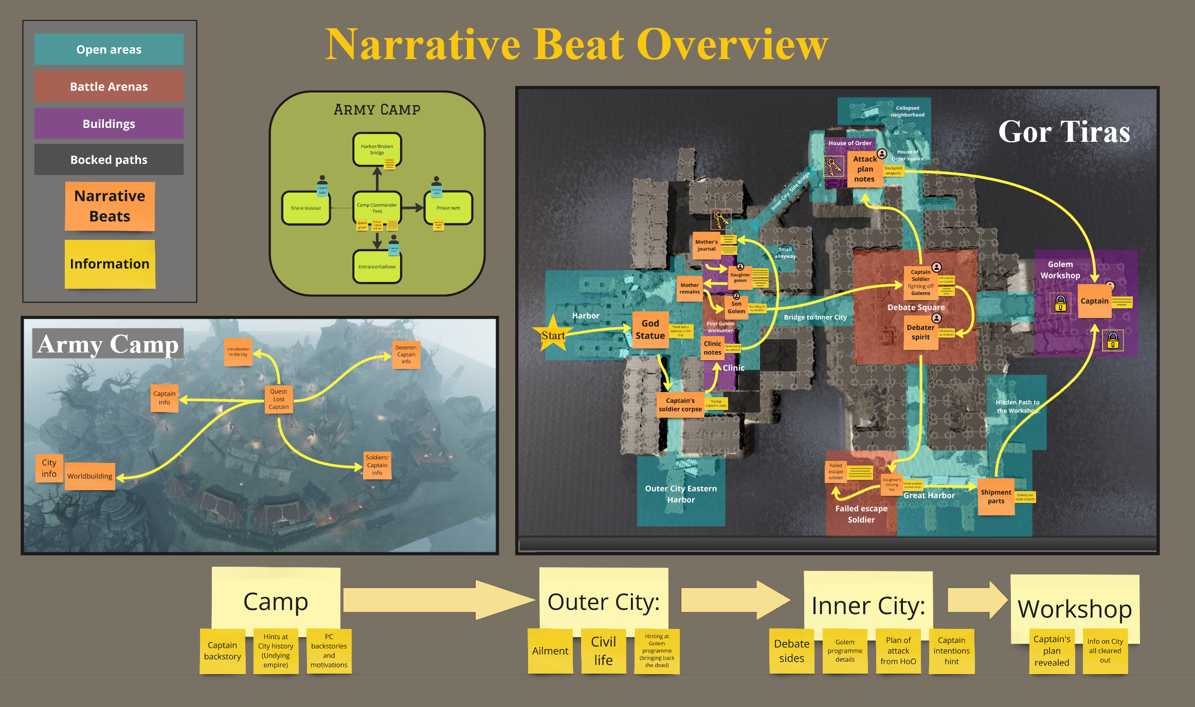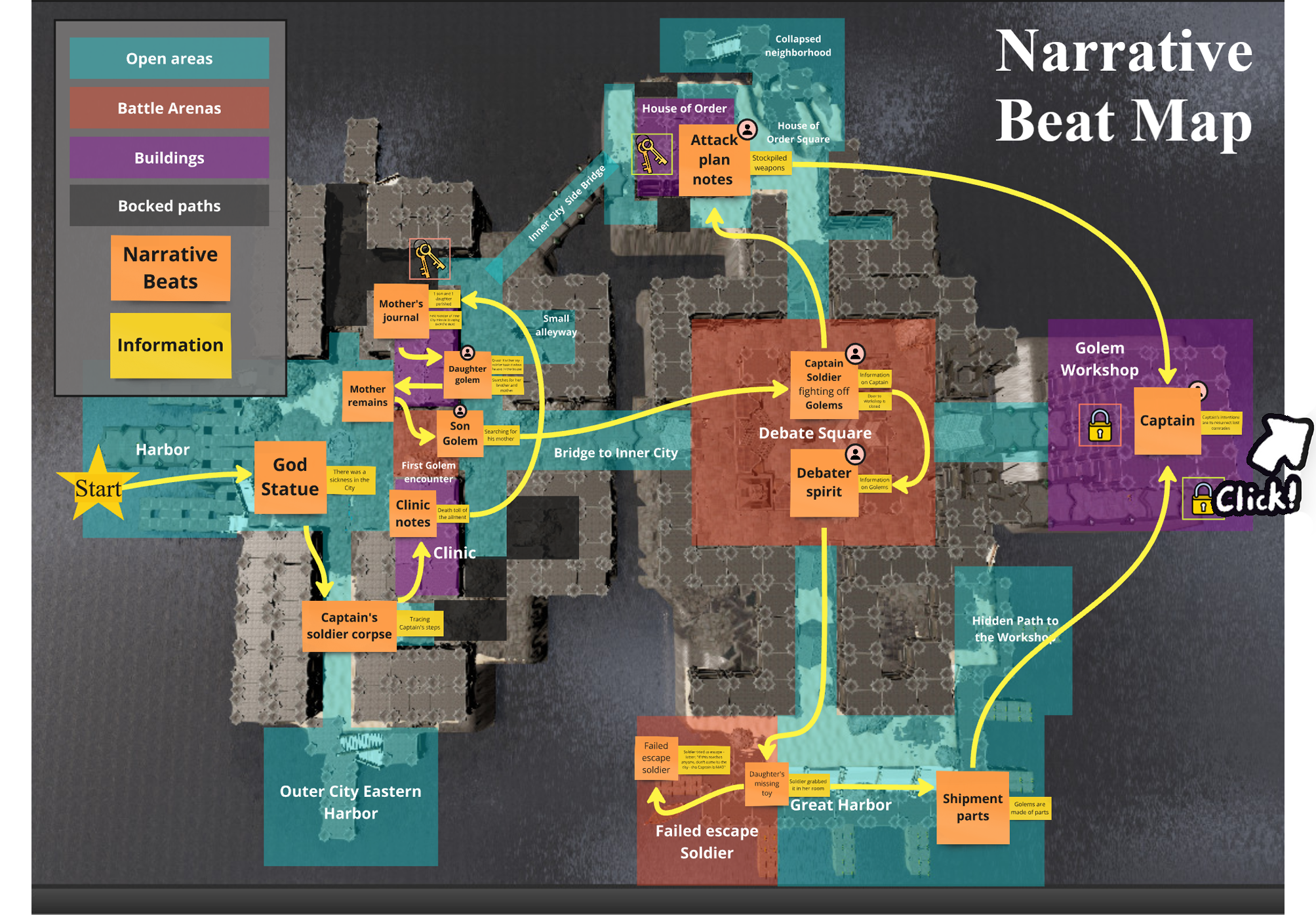 To be able to tell the story of the city well as the player progresses through it I needed to plan out how they get access to all the pieces of information, while embedding that information into the setting. To plan this out and make sure the story remains consistent and goes through a satisfying arc I created a map focused on the Narrative Beats that take place in the level.