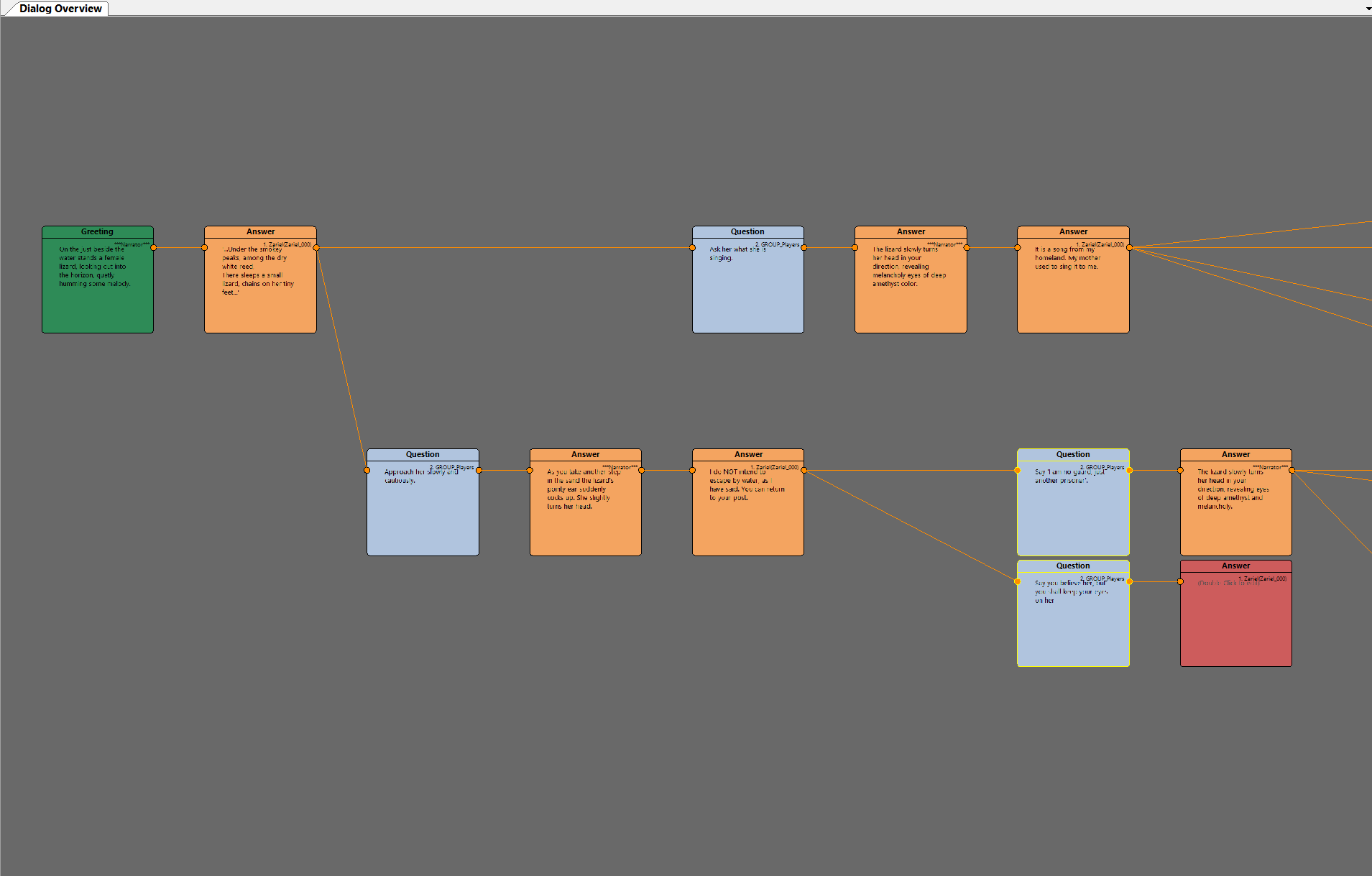 To make NPCs in the Camp feel alive and create an introduction that pulls players into the narrative I learned how to use the Dialogue Editor within the engine. I scripted dialogue options based on conditions and wrote dialogue for the characters.