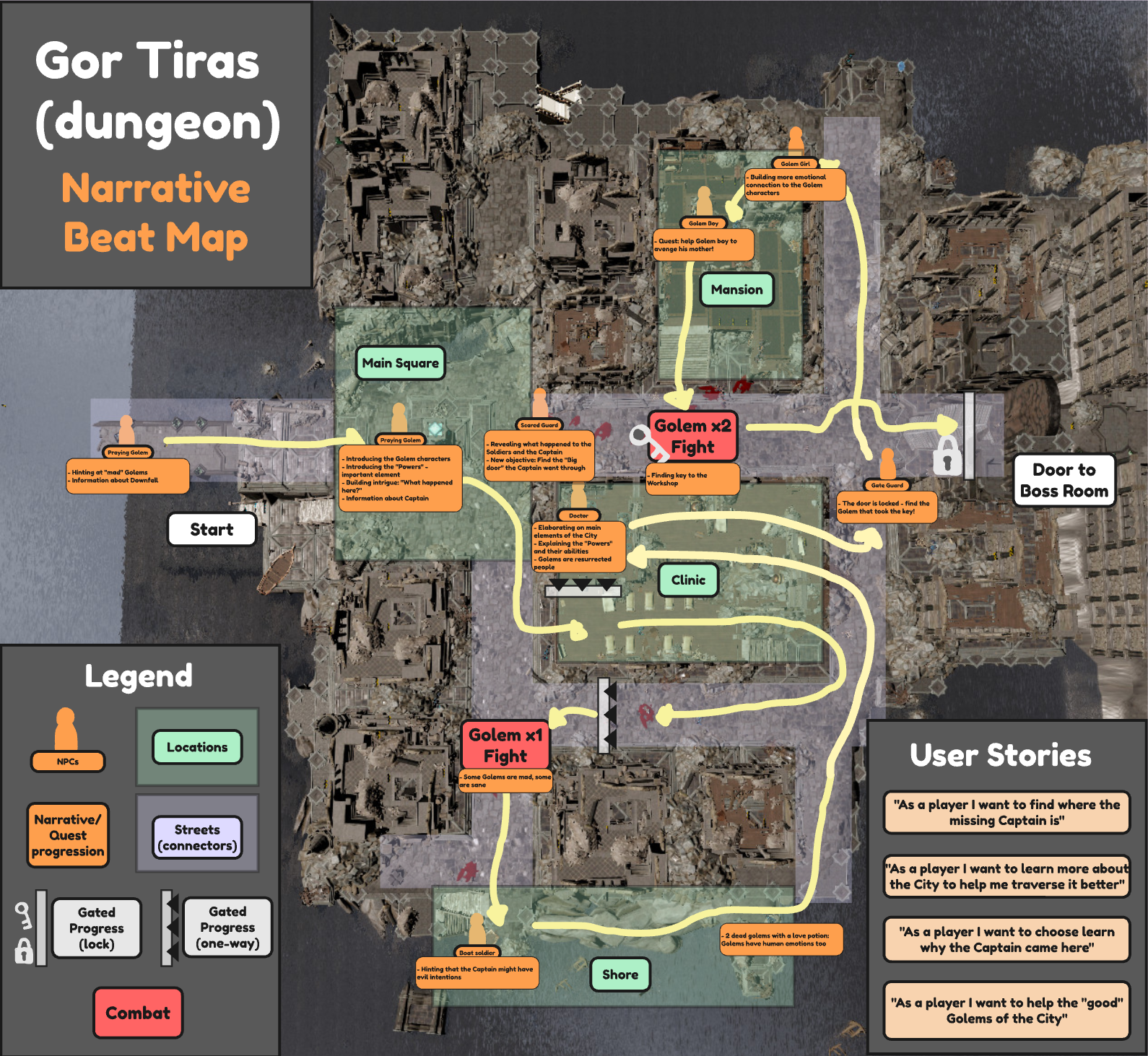 Lastly one of the biggest learnings was how interconnected the player path and the story are and how NPCs and their dialogue can be as strong a guide to the player as visual leashing or landmarks.
